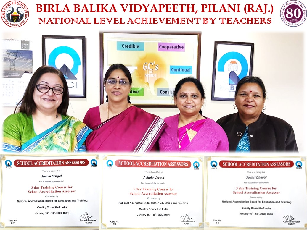 Mrs. Achala Verma (Dean Academics), Mrs. Shachi Sehgal (TGT Physics) and Mrs. Savitri Dhayal (Secondary Academic Coordinator) attended a three days workshop from 16th to 18th January, 2020 with assessments and successfully completed the course conducted by National Accreditation Board for Education and Training (NABET), Quality Council of India, New Delhi and became qualified School Accreditation Assessors.